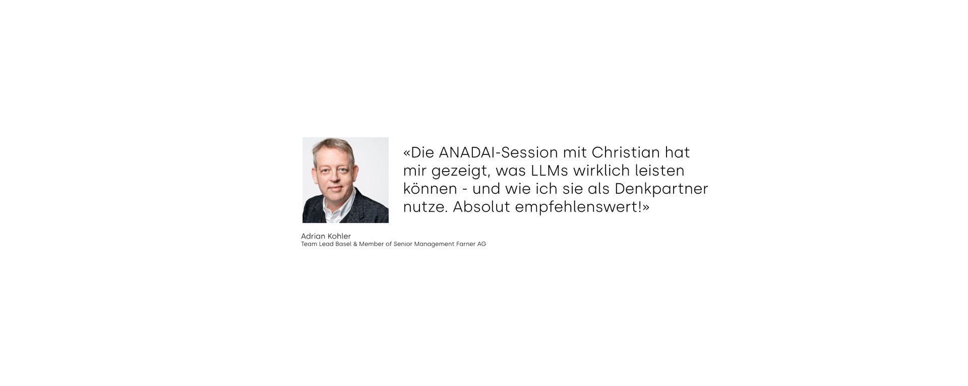 ANADAI ermöglicht dir, KI als echten Denkpartner zu nutzen, jenseits von «schreib mir einen Blogpost», «fass mir diesen Report zusammen» und «mach eine Recherche zur Firma XY».